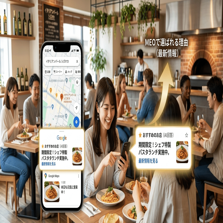 このとき、投稿機能で「最新のメニュー」や「期間限定の試み」を言語化していると、AIがその情報を拾い上げ、