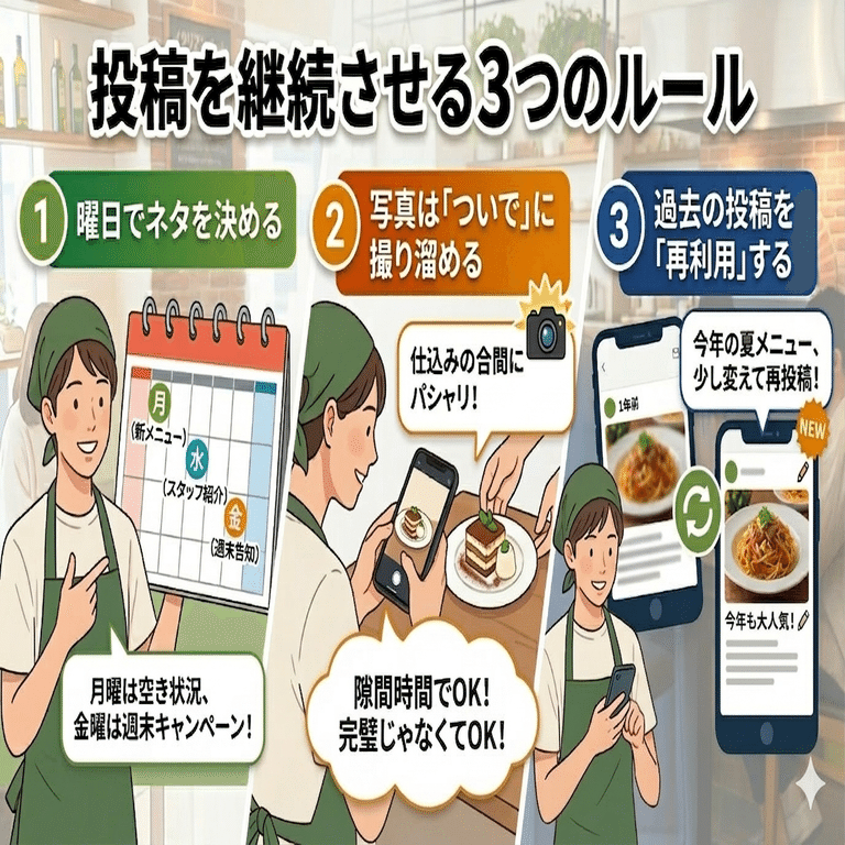 月曜は「今週の空き状況」、水曜は「スタッフ紹介」、金曜は「週末のイベント告知」など、ルーティーン化すると迷いがなくなります。 - 写真は「ついで」に撮り溜める