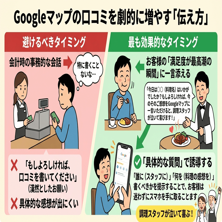 「今日は〇〇(料理名)はいかがでしたか?もしよろしければ、今のそのご感想をGoogleマップに一言いただけると、調理スタッフが泣いて喜びます!」